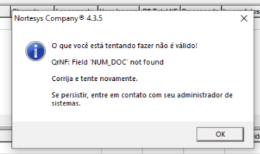 Corrigida não conformidade no sistema quando o usuário realizava a impressão de uma conferencia de NF-e retornando uma mensagem de erro: QrNF: Field 'NUM_DOC' not found.