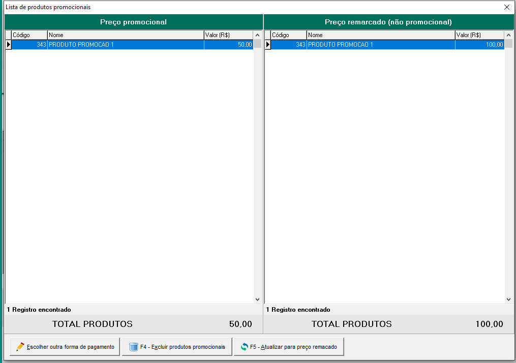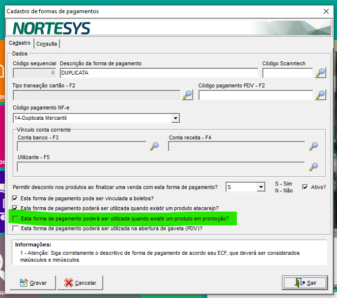 Se o parâmetro estiver habilitado e na forma de pagamento finalizadora estiver com a opção Esta forma de pagamento poderá ser utilizada quando existir um produto em promoção? estiver desabilitada: