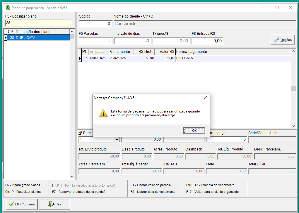 Tanto no faturamento PDV quanto no balcão o sistema irá mostrar a mensagem padrão Está forma de pagamento não poderá ser utilizada quando existir um produto em promoção/atacarejo.