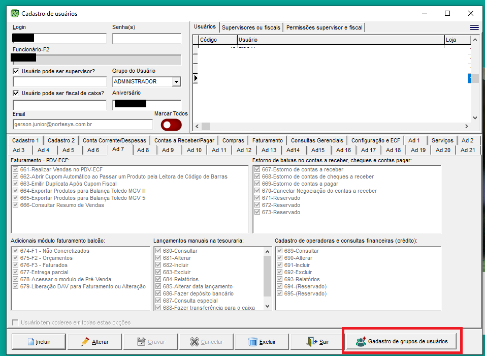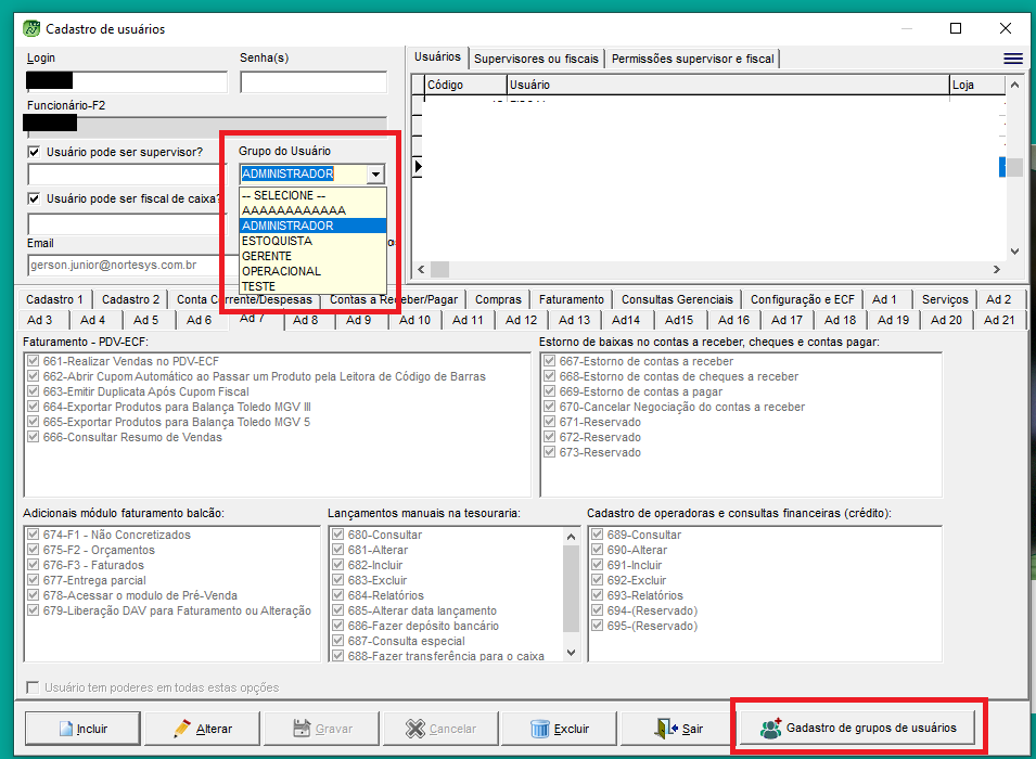 Implementado no sistema dois novos campos no cadastro de usuƔrio campos como e-mail e grupo de usuƔrios.