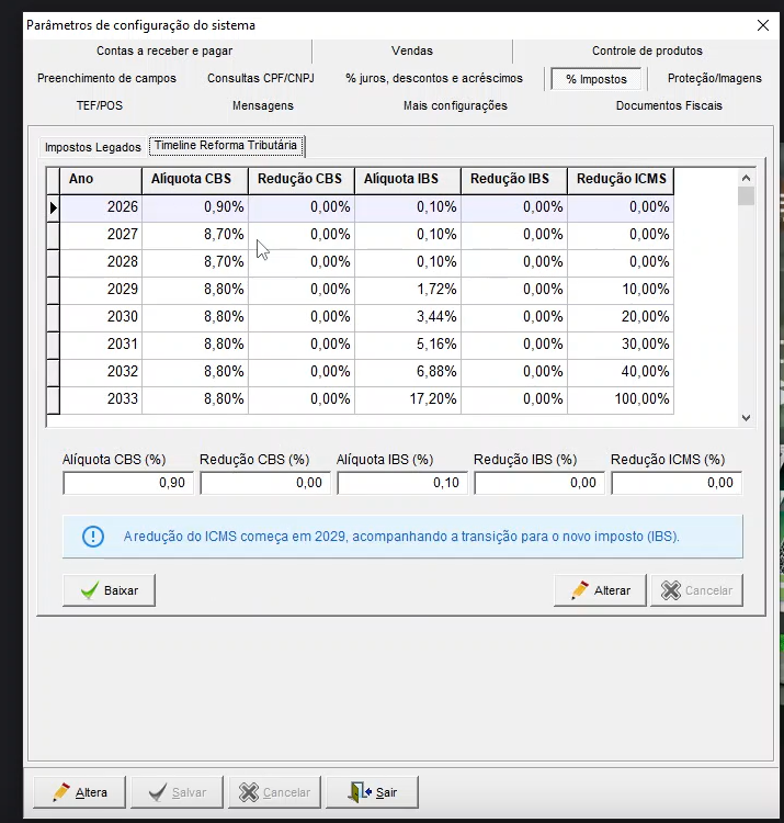 Caminho: Parâmetros do Sistema > Aba Impostos > Timeline Reforma TributÔria