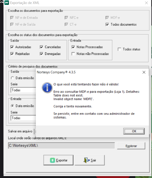 Implementadas validações estruturais no ERP para verificar a existência das tabelas e views necessÔrias aos diferentes tipos de documentos fiscais durante o processo de exportação de XML e envio por e-mail.