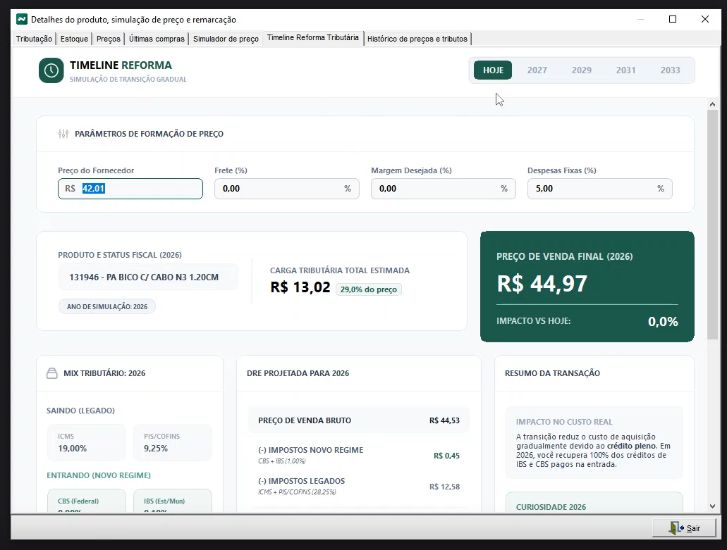 A ferramenta permite ao gestor projetar cenĆ”rios futuros, antecipar impactos no fluxo de caixa e ajustar a formação de preƧo dos produtos ao longo do perĆodo de transição tributĆ”ria.
