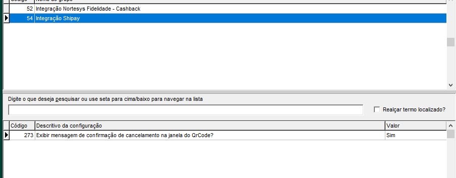 Incluído o parâmetro Configurações Outros | 54 - Integração Shipay | 273 - Exibir mensagem de confirmação de cancelamento na janela do QR Code. Quando habilitado, ao pressionar a tecla ESC ou acionar a opção Cancelar, o sistema exibirá uma mensagem solicitando a confirmação do cancelamento. Quando desabilitado, o cancelamento será realizado de forma imediata, sem exibição de mensagem de confirmação.