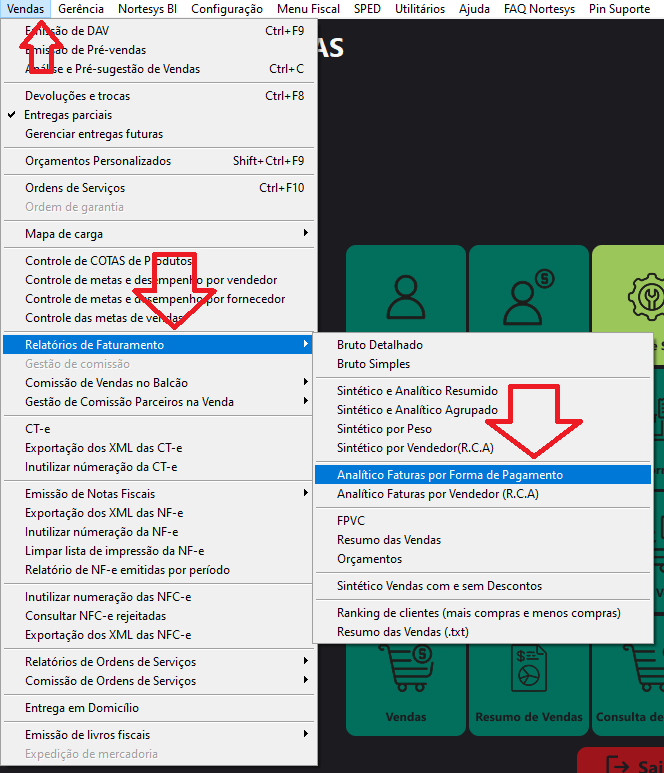 📂 Menu Vendas → Relatórios de Faturamento → Analítico Faturas por Forma de Pagamento