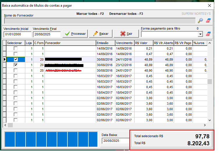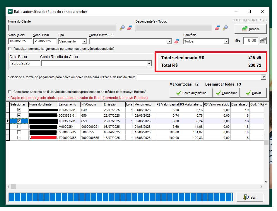 Porém, quando a baixa é feita apenas pelos títulos selecionados (independentemente do período), o sistema não apresenta o somatório dos débitos selecionados, dificultando a conferência do valor antes da confirmação da baixa.