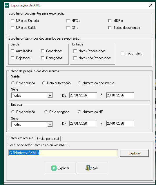 Com essa implementação, o ERP passa a oferecer uma tela de exportação completa, intuitiva e altamente flexível, organizando automaticamente os arquivos em pastas por data (ano, mês e dia), estruturadas internamente por tipo de documento (NF-e Entrada, NF-e Saída, NFC-e, CT-e e MDF-e) e status, garantindo facilidade de localização, praticidade no envio e maior eficiência nos processos fiscais.