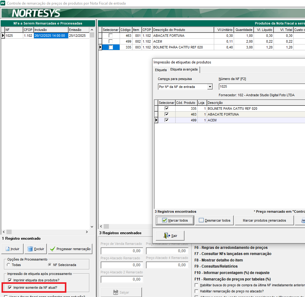 Implementada no módulo de impressão de etiquetas uma nova condição que permite imprimir etiquetas de produtos vinculados a uma Nota Fiscal, considerando apenas aqueles que tiveram preço remarcado a partir da data de inclusão da nota. Para isso, foi adicionado o filtro “Imprimir etiquetas dos produtos remarcados?”, que, quando habilitado, restringe a impressão somente aos produtos que sofreram alteração de preço.