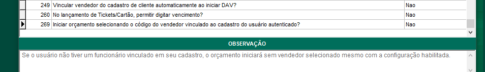 | Faturamento PDV | 110 - "(PDV) No PDV, quando for Tickets/Cartão, deseja lançar no Controle de Administradoras?" |