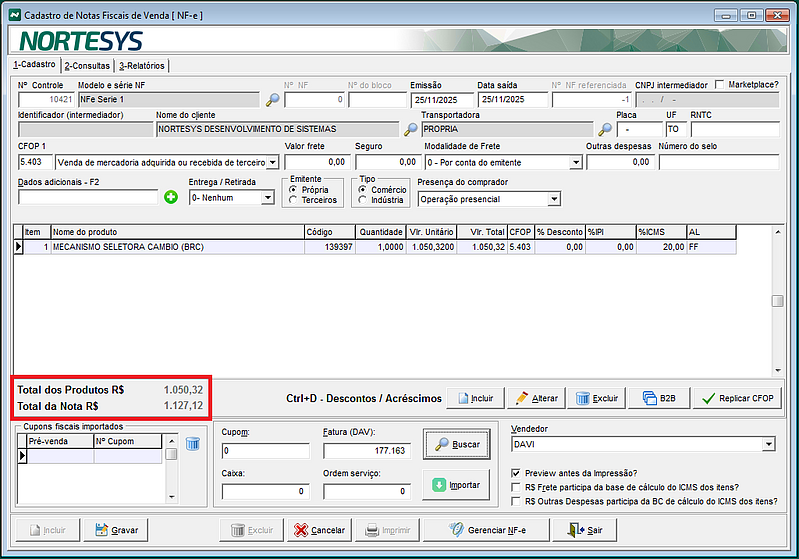- Valor Total da Nota (Mantido): Exibe a soma do Valor Total dos Produtos com a adição dos impostos, representando o valor final da nota.